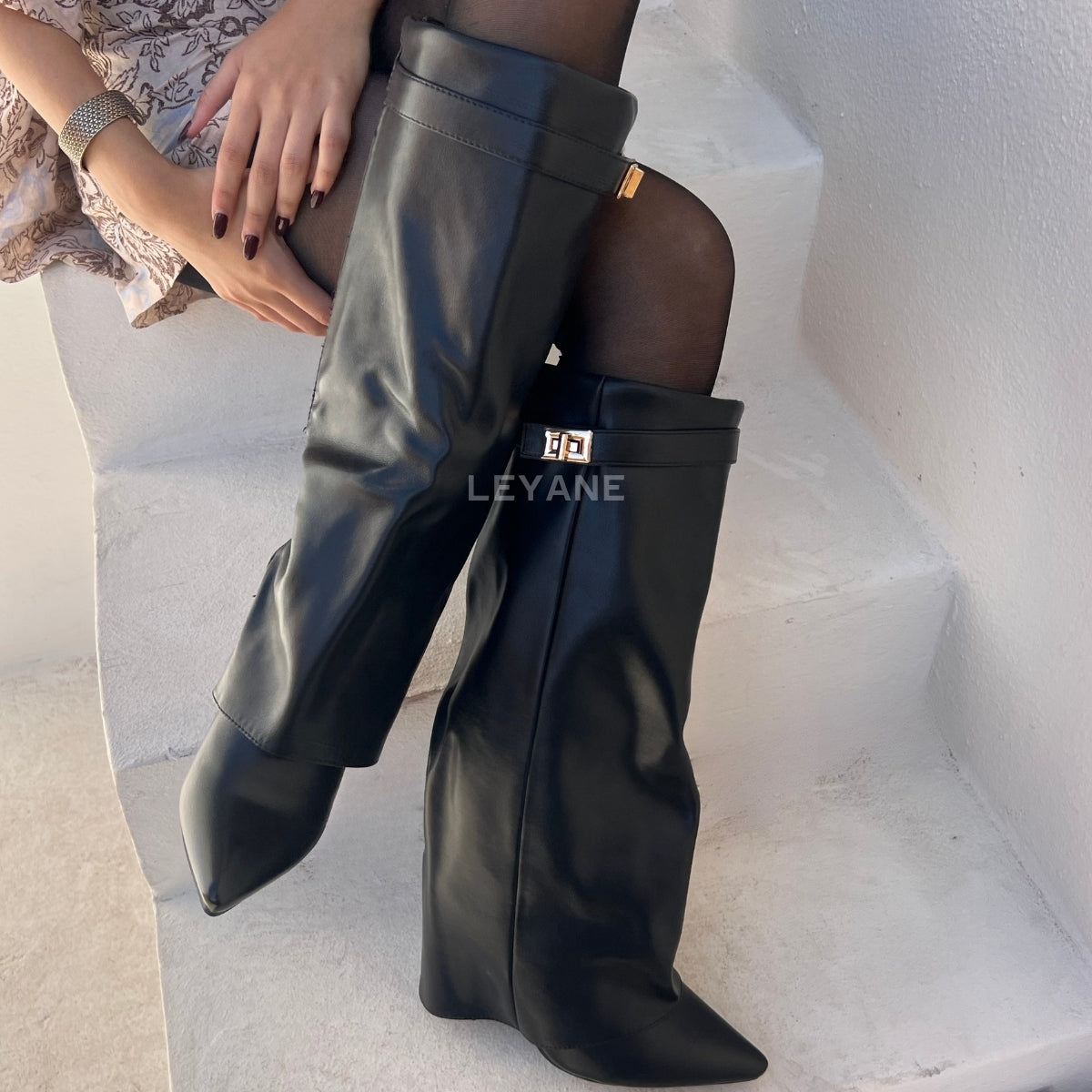 Une botte au style affirmé qui allonge la jambe grâce à sa ligne élancée et son bout pointu.