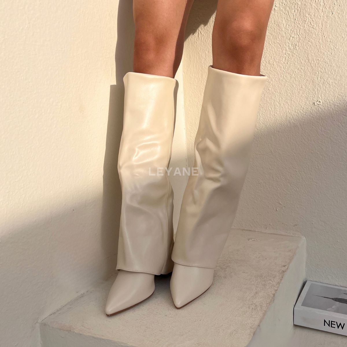 Bottes hautes en cuir synthétique à talon couleur Beige, élégantes et féminines, parfaites pour sublimer vos tenues en toute saison.