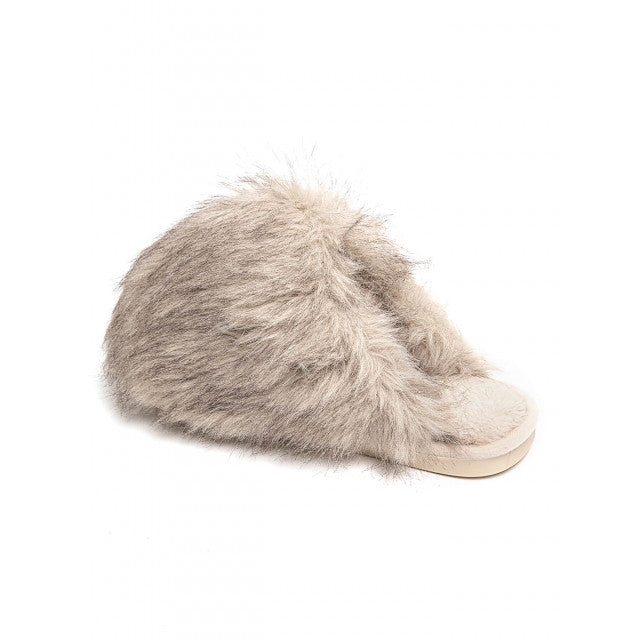 Chausson en fourrure synthétique couleur taupe. Optez pour le confort et la douceur avec cette pantoufle pour femme au style original, elle est recouverte d’une épaisse fourrure synthétique taupe, apportant chaleur et cocooning à vos pieds. Son design moderne et tendance en fait un accessoire idéal pour l’hiver, alliant praticité et élégance décontractée.