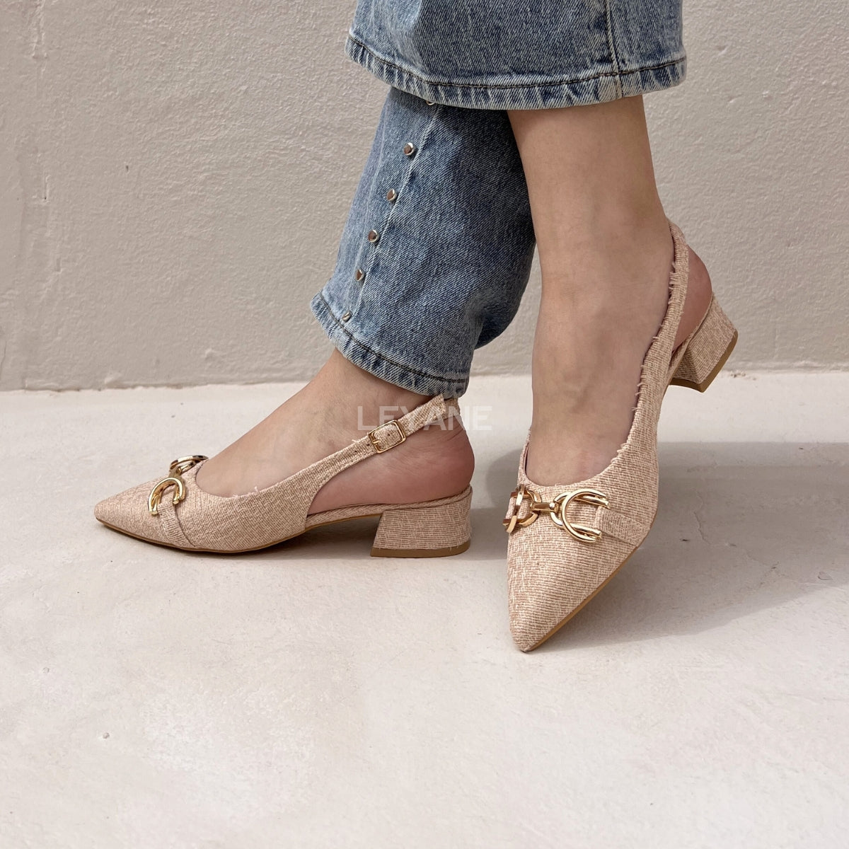 Escarpin slingback au design raffiné avec bout pointu et détail bijou doré apportant une touche élégante et sophistiquée. Leur petit talon carré assure un confort optimal tout en sublimant la silhouette. Parfaites pour un look chic du quotidien comme pour des occasions plus habillées.