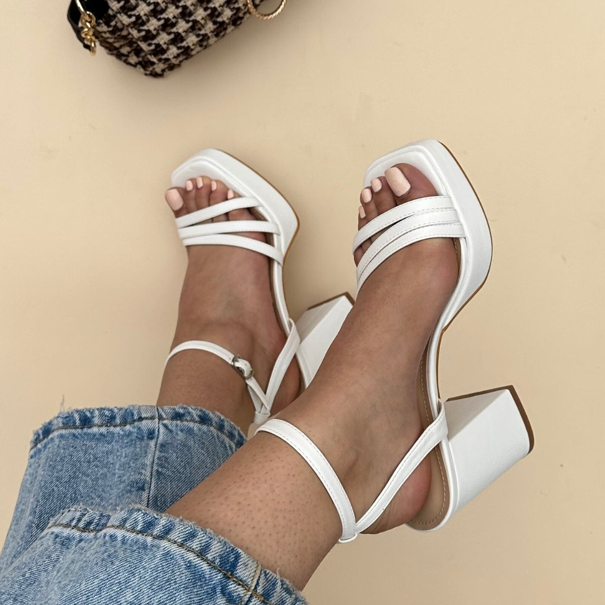 Sandales à talons en cuir synthétique confortables blanc avec détail en zircon